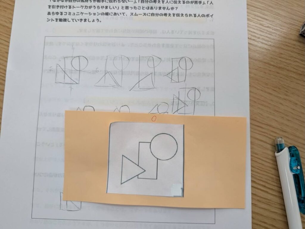 今日はコミュニケーション講座番外編「伝える力」を勉強しました。自分が見た図形を”言葉だけで“相手に伝えて描いてもらう体験をしました。言葉だけで伝えるのは難しいですよね